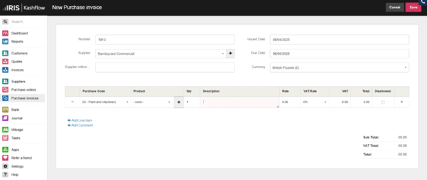 When you receive the monthly Credit Card statement, you can add the transactions into Kashflow as follows: