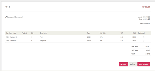 2. For each statement line, add a new line on the purchase invoice and categorise the expense. Once all transactions are added, click “Save”. This will result in a Purchase Invoice like the example below: