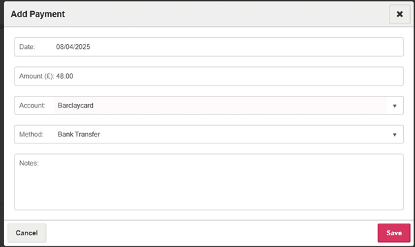 5. As with the previous method, when the Credit Card is balance is paid, post this as a payment from the Current Account to the Credit Card as follows: